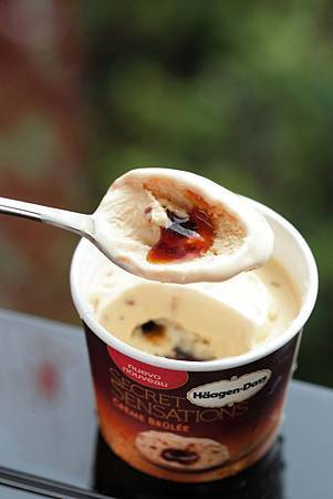 【Häagen-Dazs「融心法式布蕾」靜待10分鐘後濃郁焦糖脆片完美交融於香草冰淇淋,搭配香甜焦糖醬的融心內餡】